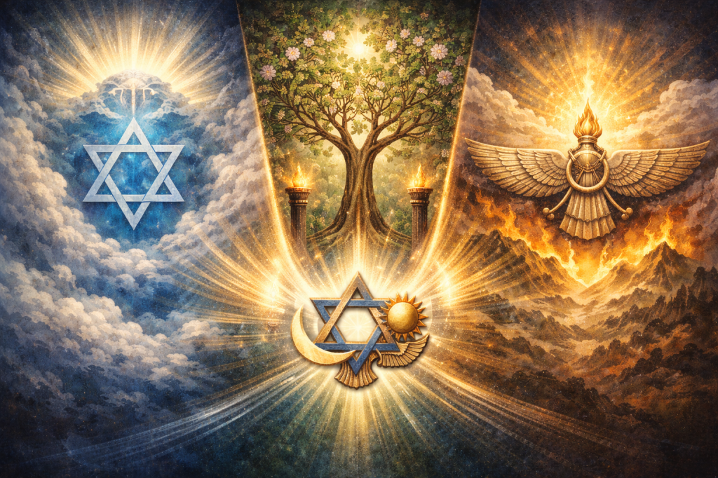 Alaha, the unity behind all existence, the voice that says Be. Asherah, the living tree, the mother who roots heaven into earth. Ahura Mazda, the light of wisdom, who teaches humanity to choose truth over deception.